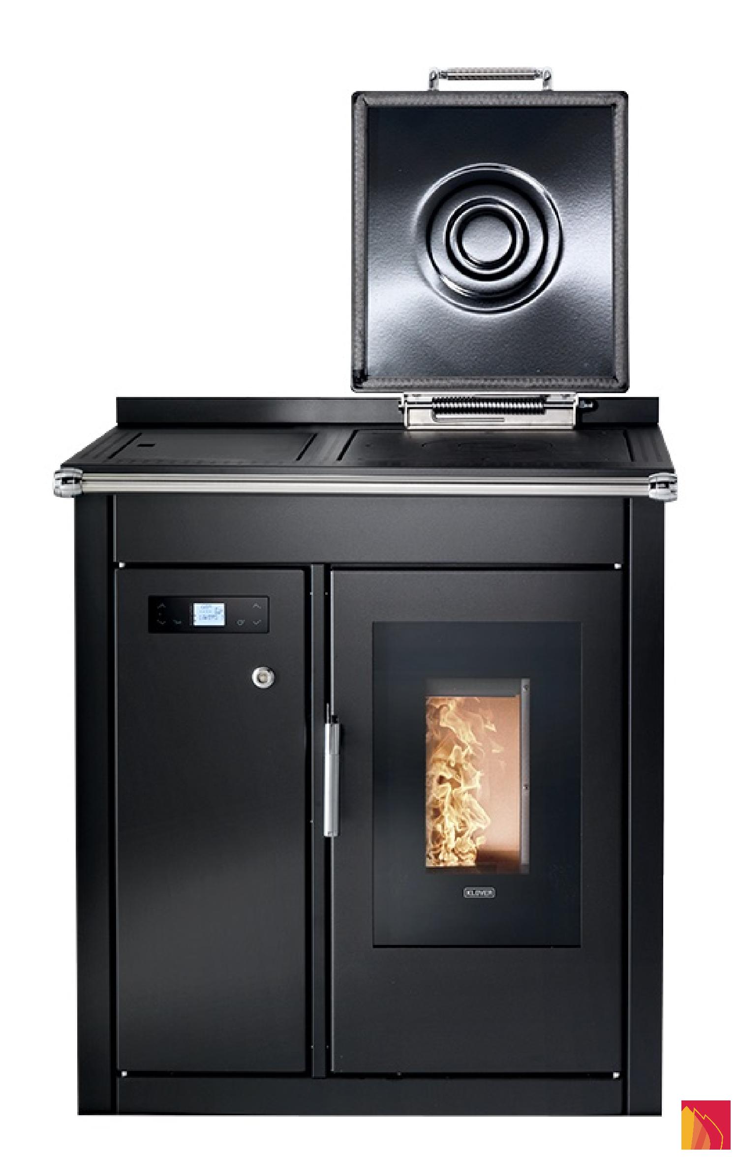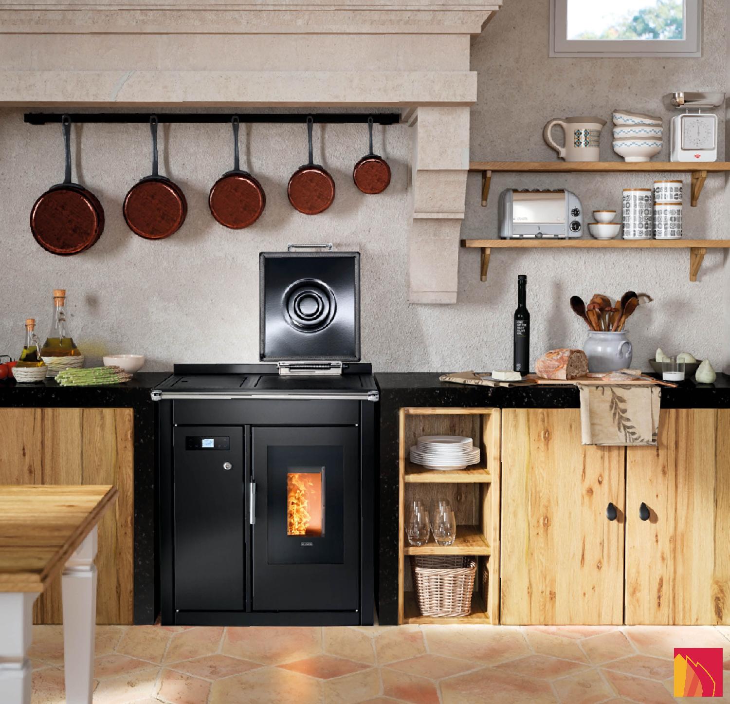 Combining the performance of a modern pellet boiler with the pleasure of cooking on a traditional stove, the Hydro Smart 80 BT stove from Klover, Italy, fits easily into any kitchen. Its compact shape and small footprint allow it to fit into our small interiors. Available in a choice of three colors (Matte Black, Cream White, Red), it will sometimes take on a retro look, and sometimes a resolutely modern look.